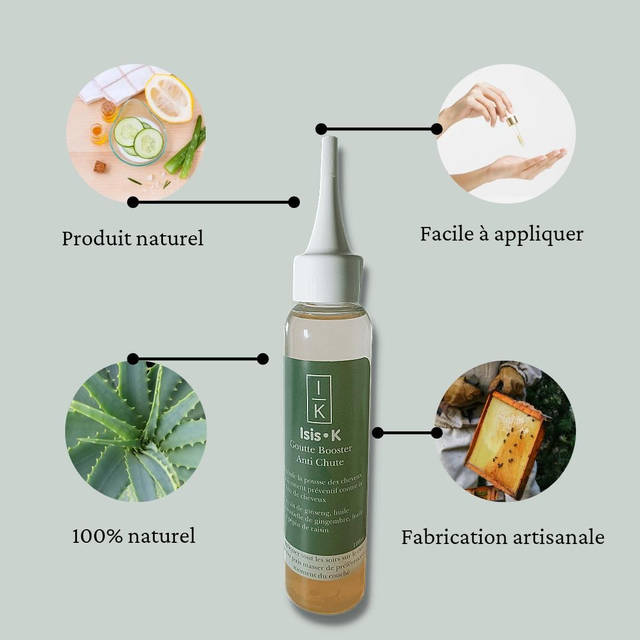 Les gouttes booster anti-chute de cheveux au gingembre et au romarin d'Isis.k sont formulées pour stimuler la pousse des cheveux et stopper leur chute. Avec leur mélange unique d'ingrédients naturels, ces gouttes agissent en profondeur pour renforcer les follicules capillaires et favoriser la croissance des cheveux. Le gingembre et le romarin sont connus pour leurs propriétés stimulantes et revitalisantes, aidant ainsi à améliorer la santé globale du cuir chevelu. En utilisant régulièrement ces gouttes, vous pouvez revitaliser vos cheveux, les rendre plus forts et plus épais, tout en réduisant la perte de cheveux. Dites adieu aux cheveux fragiles et faibles